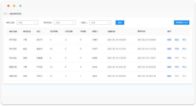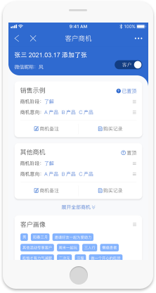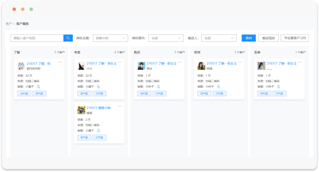 根据客户所处阶段,定制专属跟进和转化策略;看板纵览商机,客户意向标签化,推进销售跟进状态并促成成交。