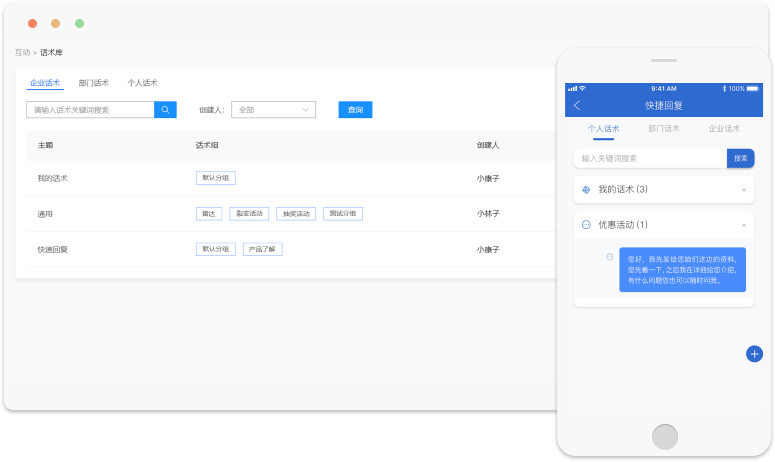 聊天常用语分类保存至话术库,关键词搜索一键发送,快速解答客户疑问。