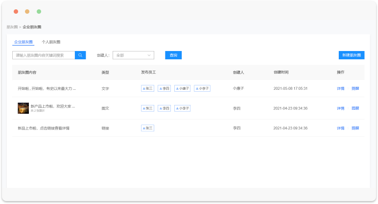 统一设置企业朋友圈,打造品牌专属人设,保障客户极致体验。