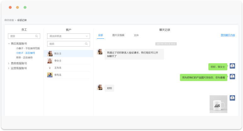 聊天侧边栏可查看并记录客户信息、来源渠道、标签、浏览轨迹,全部数据沉淀至客户列表。