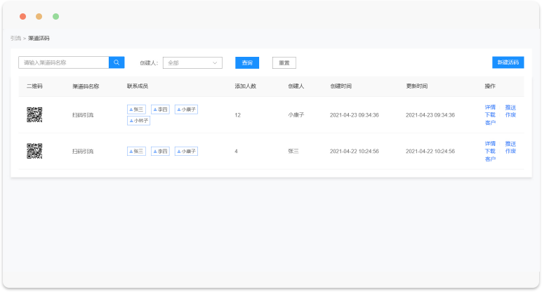 识别来源自动打标签,多人扫码分流,提升承接效率。